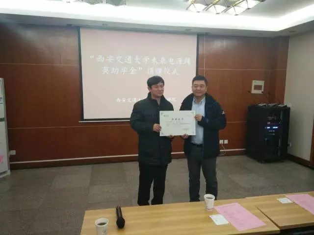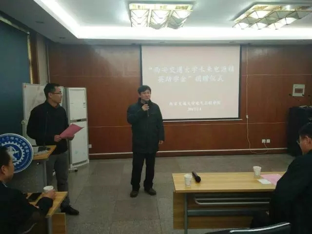 2017年1月4日上午,第二期“西安交通大学东升国际 未来电源精英助学金”捐赠仪式在电气工程学院北会议室顺利召开。本次捐赠仪式由西安交通大学电气学院党委副书记宋杰主持,出席仪式的捐赠方代表有:电源村村长代新社,亿曼丰科技(深圳)有限公司向总经理,合肥东升国际 电源系统有限公司总经理傅仕涛、研发经理唐德平,陕西东升国际 能源科技有限公司经理鲍鑫,合肥东升国际 电源系统有限公司助理汪艳,西安爱科赛博电气股份有限公司董事长白小青;出席仪式的西安交通大学领导有:电气学院副院长杨旭、电气学院党委副书记宋杰、电气学院学生工作主管高丹军、电气学院辅导员李茜。
